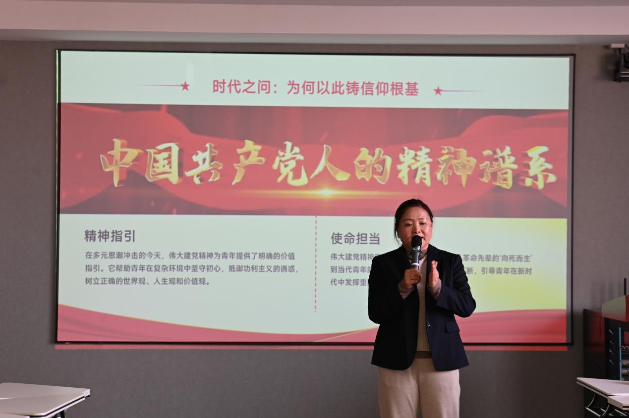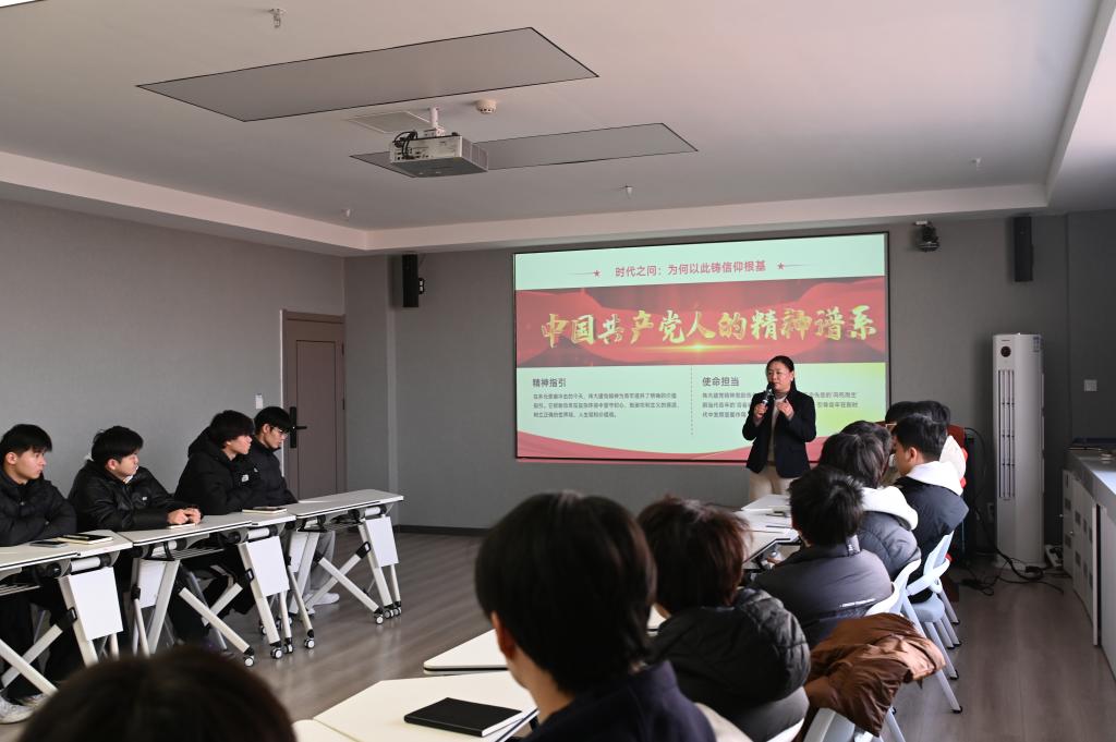 韩丽丽以《赓续精神血脉,勇担青春使命——中国共产党人精神谱系学习》为主题,从精神之源、精神之脉、精神之魂、精神之行四大核心维度,回溯了中国共产党的精神原点,展现了不同历史时期中国共产党人精神传承与发展的脉络,强调了信仰信念信心是共产党人攻坚克难、一往无前的力量支撑,鼓励同学们筑牢信仰之基、补足精神之钙,要在理论学习中感悟精神力量、在社会实践中践行精神内涵、在日常修身中锤炼意志品质,将个人理想融入国家发展大局,用青春的能动力和创造力书写时代答卷。